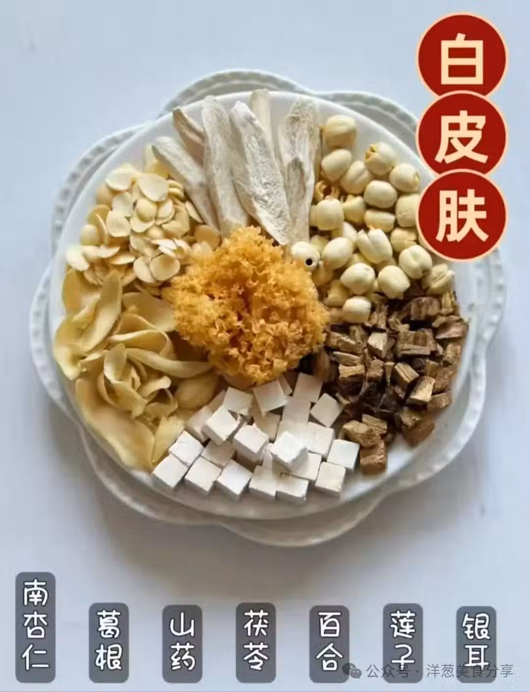 日常容易被曬黑,臉色常常發黃的姐妹們可別錯過這款茶哦。銀耳滋陰潤肺、美容養顏,蓮子養心安神,茯苓健脾祛濕,山藥補脾養胃,百合潤肺止咳,南杏仁潤膚通便,葛根解肌退熱、生津止渴,它們相互協作,通過由內而外的調養,說不定能讓咱們逆襲成冷白皮呀,真的可以試試看呢