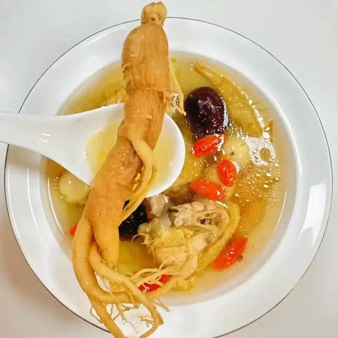食材用量:人參1根、雞1隻、紅棗5顆、枸杞10克、蔥段、薑片適量、料酒少許、鹽適量。