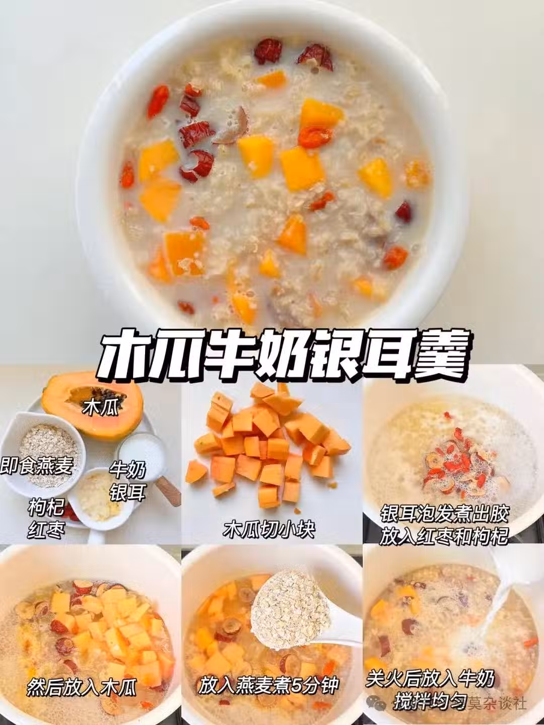 食材:燕麥片40g | 木瓜半個 | 牛奶200ml | 銀耳1小朵 | 蜂蜜適量