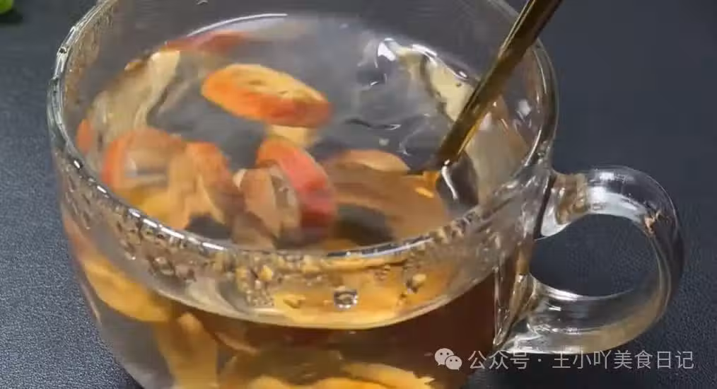 6、攪拌均勻:20分鐘後,揭開蓋子或大碗,用勺子將飲品攪拌均勻。此時,冰糖已經完全溶解,山楂和黃芪的營養成分也充分釋放到了水中。