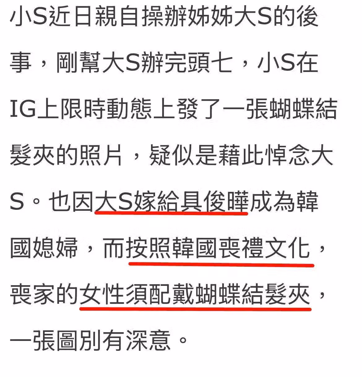 小S公公離世時,大S與具俊曄到場送別,當時她就身穿黑袍、披著黑色頭紗,戴了白色的胡蝶髮夾。