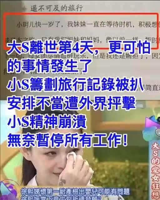 大S離世第4天,更可怕的事情發生了,小S籌劃旅行記錄被扒,安排不當遭外界抨擊,小S精神崩潰,無奈暫停所有工作