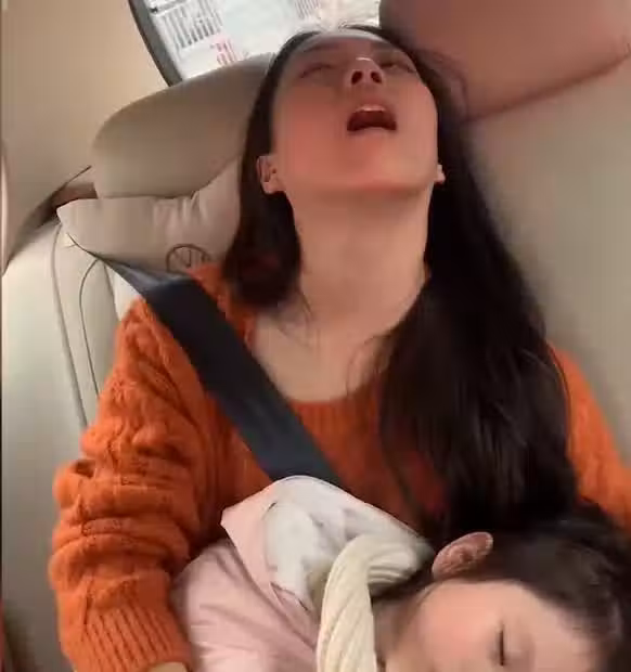 女子手上抱著女兒睡得正香,仰著腦袋、嘴巴張開、眼睛微微睜開,睡得很深沉,可能正在做美夢,也可能是該女子實在很累了,坐在車后座上睡得很死,沒了往日優雅的樣子。