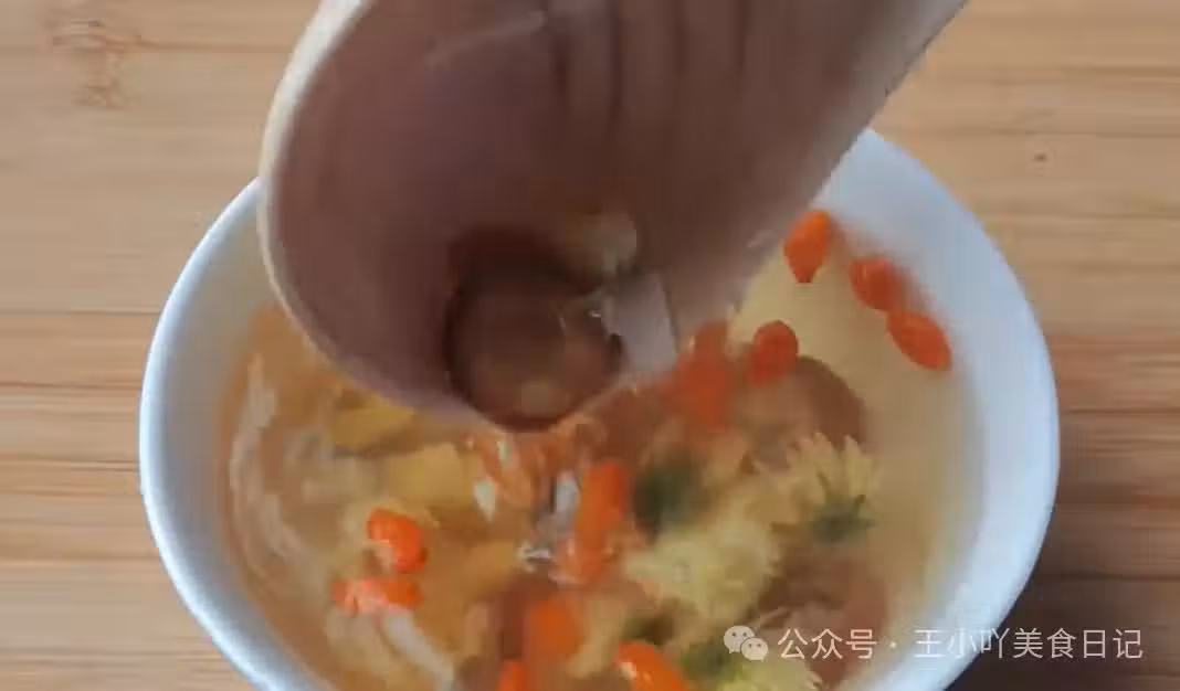 6.出鍋享用:關火後,讓飲品自然冷卻至適宜飲用的溫度。最後,將其盛入碗中或杯中,即可享用。這道菊花茯苓飲口感清新,既有菊花的淡雅香氣,又有山楂的酸甜滋味,加上茯苓的醇厚與枸杞的甘甜,每一口都是對味蕾的極致誘惑,更是對身體的溫柔呵護。
