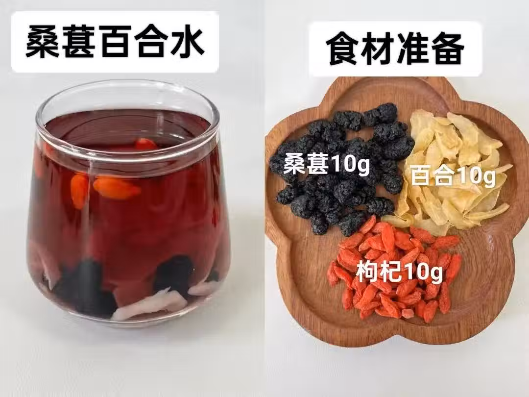食材:桑葚干、干百合、枸杞各10g