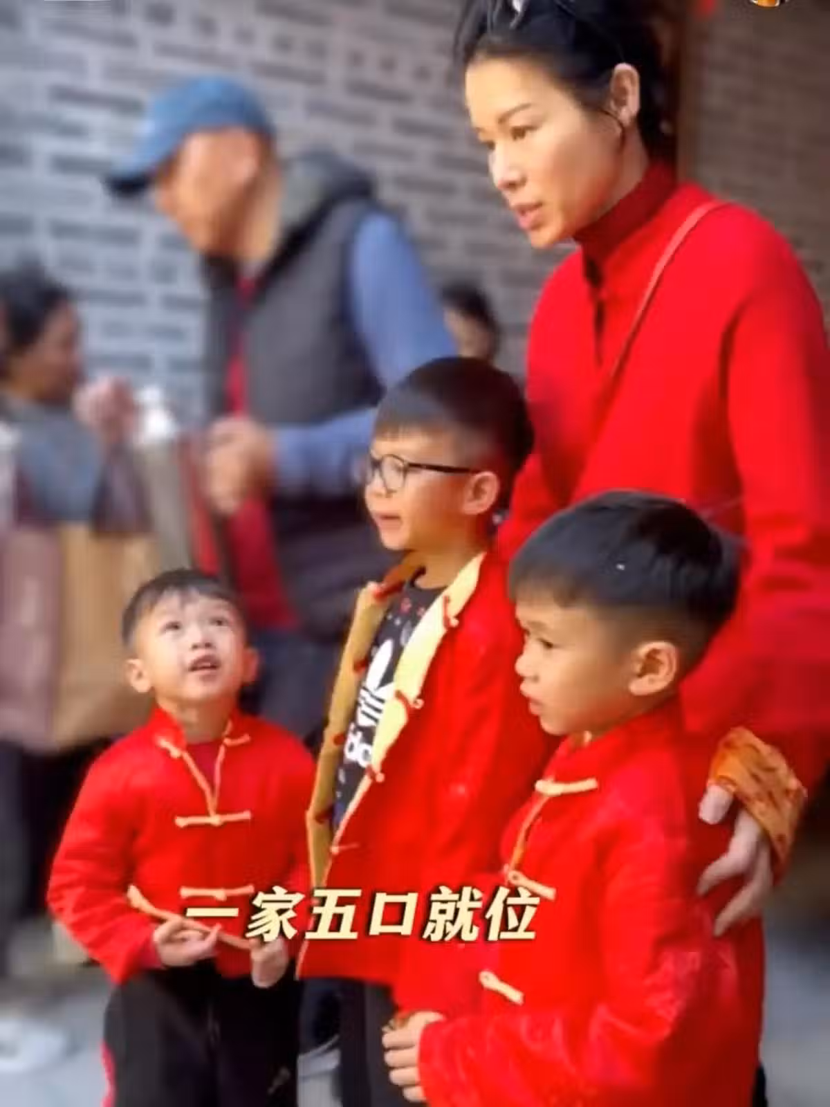 胡杏兒春節帶三個兒子回祠堂祭祖,化身客家媳婦,挑扁擔很接地氣