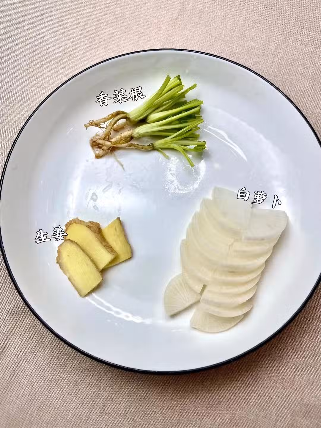 香菜根:6棵,帶一寸莖部,帶皮白蘿蔔半個,姜3片