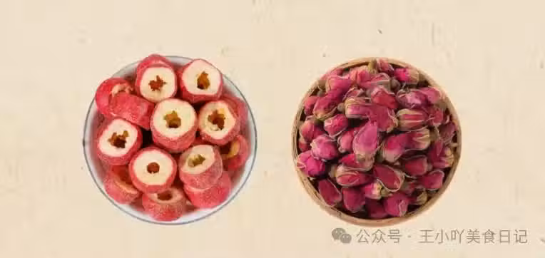 取山楂干6片,玫瑰花3朵,放入茶杯中。