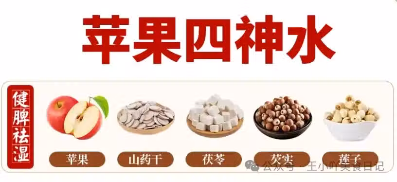 蘋果四神水:健脾祛濕的聖品 山藥干:性平,味甘,歸脾、肺、腎經,能補脾養胃,生津益肺,補腎澀精。 茯苓:性平,味甘、淡,歸心、脾、腎經,利水滲濕,健脾寧心。 芡實:性平,味甘、澀,歸脾、腎經,益腎固精,補脾止瀉,除濕止帶。 蓮子:性平,味甘、澀,歸脾、腎、心經,補脾止瀉,止帶,益腎澀精,養心安神。