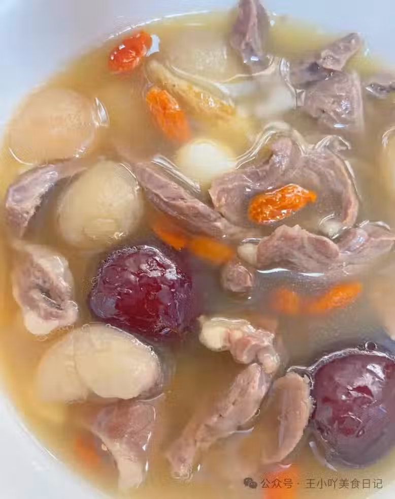 3、最後調味:燉煮 1 - 1.5 個小時後,加入一把枸杞和適量的鹽。枸杞不宜過早加入,以免燉煮時間過長導致營養流失。繼續煮 5 分鐘左右,讓枸杞的營養融入湯中,同時使鹽均勻分布,調整湯的味道。此時,一碗香甜可口、養心安神的桂圓蓮子豬心湯便大功告成。每周飲用三次,有助於改善睡眠質量,讓人能夠擁有安穩的睡眠,告別失眠的困擾。