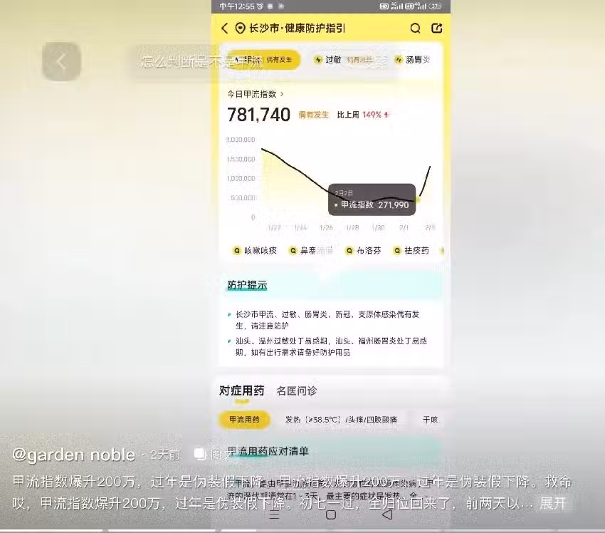 貴州的「秋風落葉」2月4日回應說,上個月自己因甲流住院,病床兩邊的兩個姐姐都是四十多歲,也是甲流,還有肺炎。「我住進去的第二天,早上一個姐姐猛咳,喘不上氣,家屬趕緊找醫生,也就是四五分鐘人就不行了。