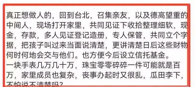 作為最親的姐妹,小S責無旁貸,應該請來家族德高望重的長輩,在眾人見證下,清點大S的存款和首飾,並且登記造冊。