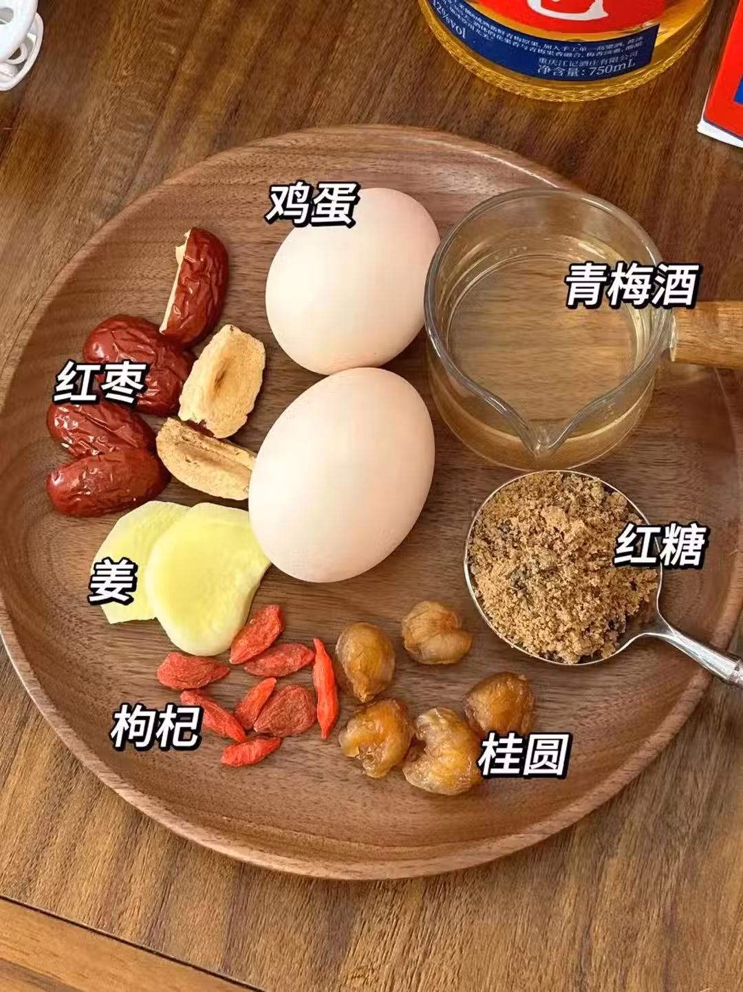 🥗食材準備:桂圓5顆、雞蛋2顆、枸杞8粒、姜2片、紅糖1勺、紅棗2顆、青梅酒