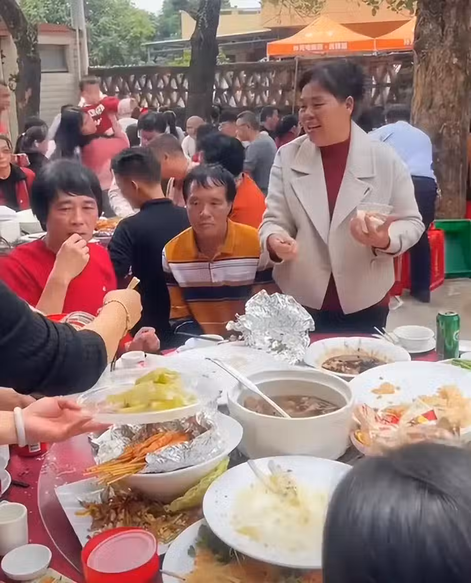全爸也在招呼客人,他看到妻子端著一碗飯站著吃,就讓她坐下來吃飯,他來招呼客人。全爸還是很愛護妻子的。