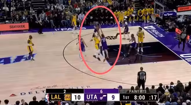 當時比賽第1節就出現了直接抱怨判罰的時候,東契奇有一次拋投出手裁判沒給哨,他直接開始攤手抱怨裁判,然後詹姆斯站在中間中圈附近,也在攤手怪裁判,倆人全在攤手怪裁判,誰還能防守?湖人3個人怎麼防對面5個?人家爵士隊直接前場3打0扣籃了。