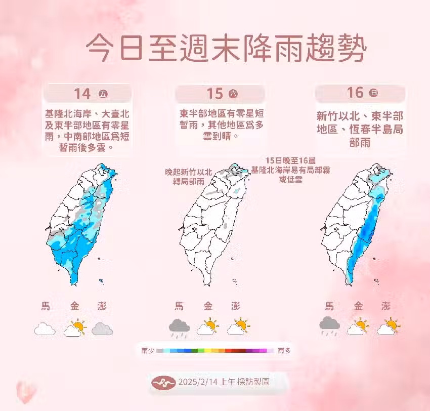 大台北地區偶有短暫雨勢,桃竹苗及中部地區清晨雖有局部降雨機率,但到了白天會轉為多雲。