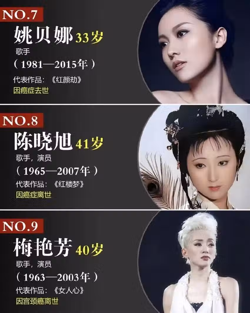 姚貝娜:33歲歌手(1981--2015年)代表作品:《紅顏劫》因癌症去世。