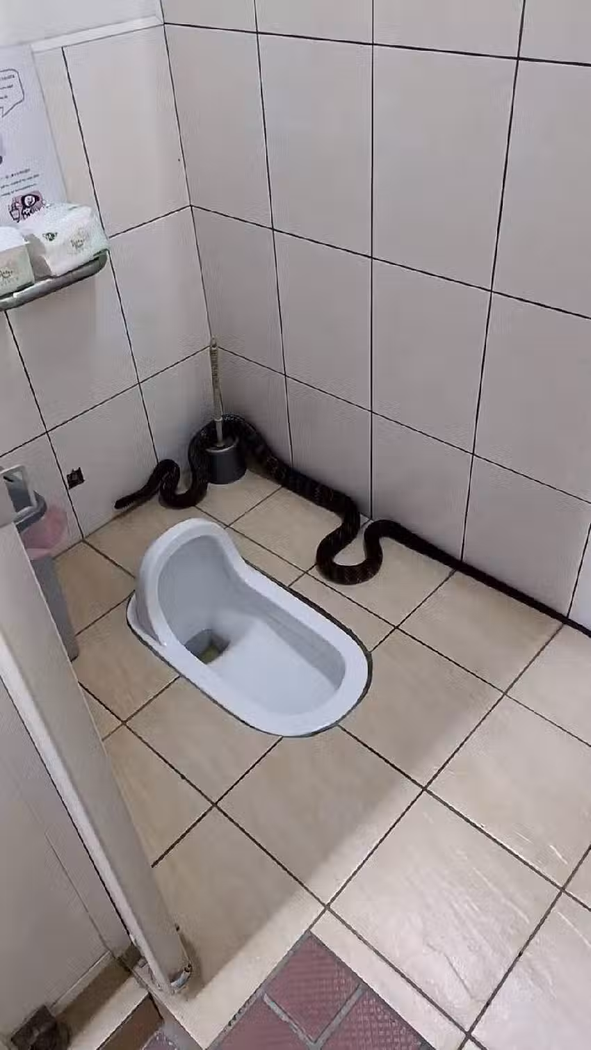 」畫面中可以看到,他打開廁所門急著要上廁所,沒想到隔間角落竟然出現一隻粗長黑蛇沿著牆壁爬行,尺寸之大讓原PO當場嚇壞!