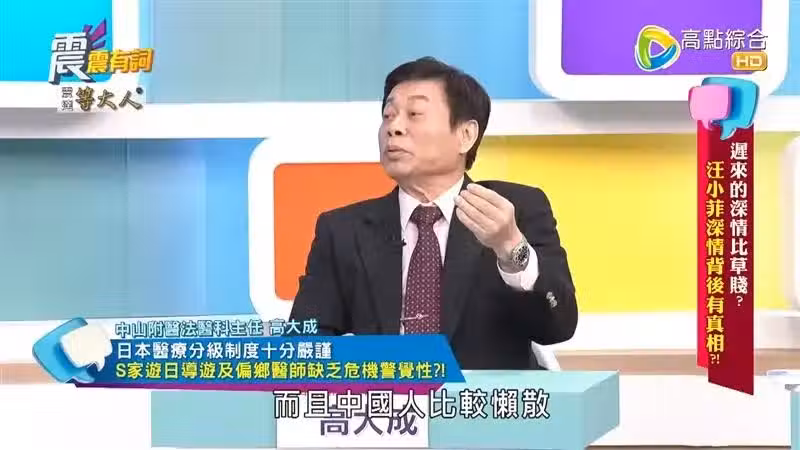 大S去日本玩,沒想到發生流感引發肺炎過世的憾事,至今許多人仍無法接受,尤其她明明還算年輕,對此,曾待過日本,又有法醫身份的高大成指出,臨床方面,日本其實跟台灣差不多,更點出會發生這樣的事情,可能有一部分和「導遊」也有關。