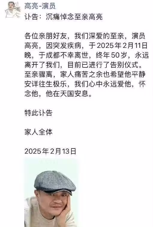 演員高亮的家屬13日透過微信朋友圈發布訃告。(圖/翻攝自我是來吃瓜的微博)