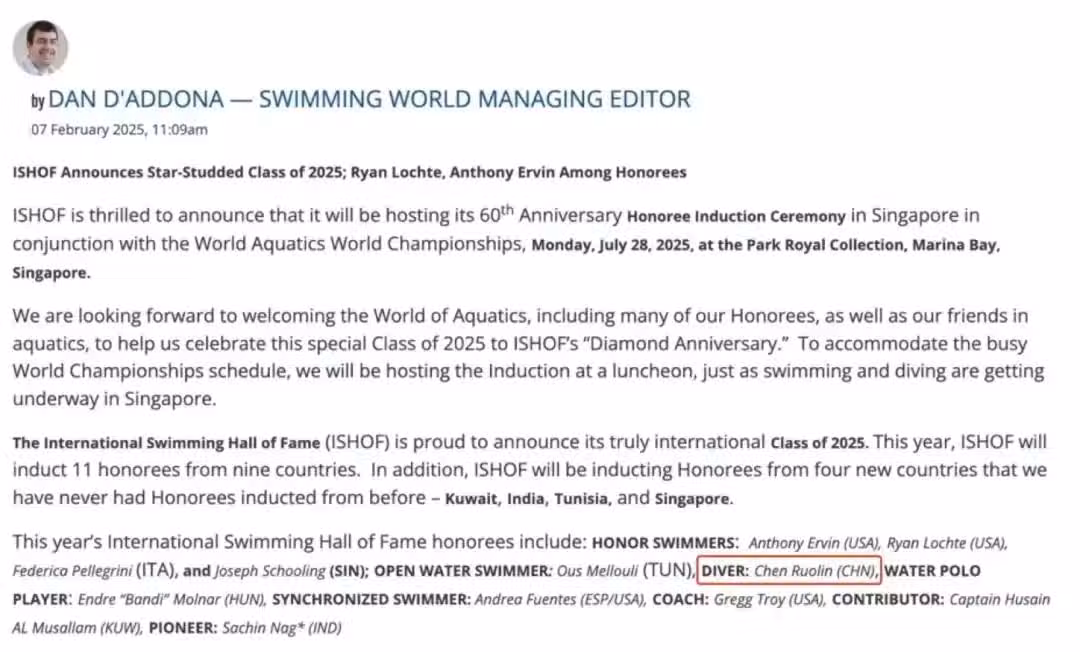 為了表彰陳若琳對於推動國際跳水運動的發展所做出的突出貢獻。近日,據美國權威游泳媒體《世界游泳》雜誌報道,國際游泳名人堂已經公布了2025年新入選人員名單,原中國跳水運動員陳若琳榜上有名,同時她也是今年唯一入選的跳水運動員。這無疑是對陳若琳個人曾經所取得的成就肯定和褒獎。