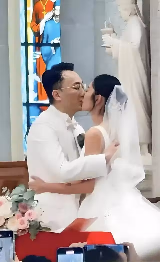 恭喜!香港知名女星風光大嫁,穿深v婚紗與多金老公教堂熱吻