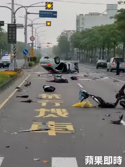 警方表示,車子先撞上機車騎士後,再失控沖向外側人行道,連擦撞兩棵行道樹,反彈迴路面後翻覆。