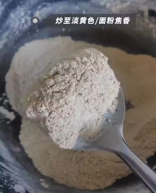 3.炒好的麵粉取適量出來,加入紅糖,然後用滾燙的開水一邊澆一邊用筷子快速攪拌,直到攪拌成濃稠適中的糊狀,就可以開吃啦!記得,水要多放點,紅糖也要足,太稠了可不好吃,影響口感!