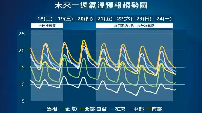 氣象專家吳德榮在專欄「泄天機教室」里也提到,最新歐洲模式模擬顯示,周五(21日)鋒面掠過,北部、東半部有局部短暫雨,冷空氣南下,氣溫漸降;周六至下周一(22至24日)強冷空氣緩慢南下,比上波濕冷,影響時間也較久,部分平地的最低氣溫仍將降至10度以下,要注意保暖。