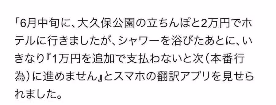 不過根據《集英社》報道指出,在6月17日收到了一名台灣遊客的爆料,稱明明談好2萬日元的價錢,但是到酒店洗澡後,對方卻拿出翻譯APP,表示如果不再支付1萬日元,就不能進行下一步。無奈他只好付錢,但是在床上的時候,女方卻說很疼,轉身辱罵男子。反覆多次後,女子指著手機時間,說時間到了,便匆匆離開。