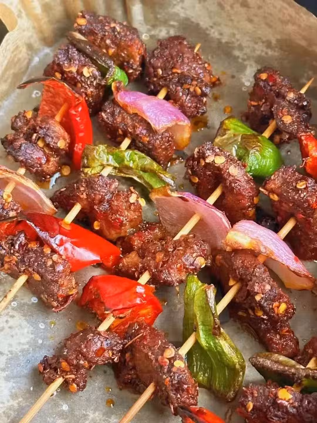1️⃣ 牛排切塊+彩椒洋蔥塊交替串簽