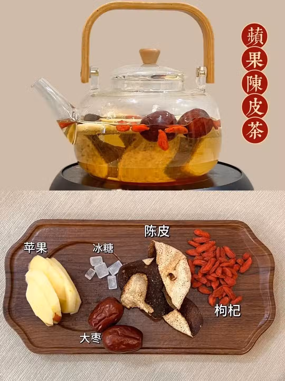 姐妹們,你們是不是也經常手腳冰涼或者飯後小腹脹脹的?今天教大家幾款陳皮的用法,既能化解油膩,又能溫和驅寒。 大家千萬不要小看陳皮,它可以健脾理氣、燥濕化痰,助力脾胃化解不適。陳皮還含有揮髮油,經常食用有一定抗菌消炎作用,可以增強身體免疫力,還能讓我們保持大腦清醒。 每天上午沖泡一杯陳皮茶,提神醒腦,比喝咖啡強多了!大家快來試試吧。 一、蘋果陳皮茶:給脾胃「減負」的小甜水 食材:蘋果1個、陳皮5克、紅棗3顆、枸杞10粒 做法:蘋果切塊去核,陳皮提前溫水泡軟颳去白瓤(減少苦味),所有材料加水煮15分鐘,最後撒枸杞燜2分鐘。 特點:蘋果的果香中和陳皮微苦,喝完胃裡暖乎乎,適合飯後喝。蘋果富含果膠,搭配陳皮能促進消化,尤其適合吃撐了、肚子脹的時候。 二、陳皮薑茶:驅寒界的「黃金搭檔」 食材:陳皮5克、生薑3片(怕辣可減量)、紅棗2顆、枸杞少許 做法:陳皮、生薑和紅棗冷水下鍋煮10分鐘,關火前加枸杞攪拌。趁熱喝,從喉嚨暖到胃! 特點:生薑驅寒發汗,陳皮理氣,特別適合冷風吹後打噴嚏、手腳冰涼的人。經期怕冷、容易痛經的女生,可以把紅糖換成黑糖,效果更好。