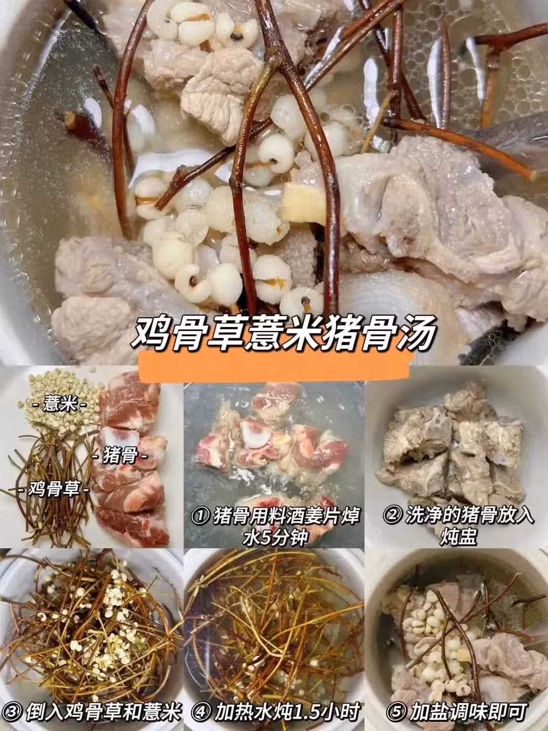 食材:雞骨草30克、薏米50克、豬骨400克、紅棗2顆。 做法: 1、雞骨草洗凈剪段(藥店購買已處理好的更省事),豬骨用料酒和薑片焯水5分鐘,洗凈後放入燉盅; 2、所有食材放入燉盅,加水大火煮開轉小火燉1.5小時; 3、撈出雞骨草,加鹽調味即可。 小貼士:雞骨草微苦,蜜棗可調和口感,濕熱黃疸者喝更佳。 四、五指毛桃薏米湯 補氣祛濕「雙管齊下」,喝出「脾胃之力」。