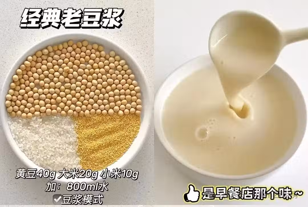 - 功效:黃豆富含植物蛋白、異黃酮等,可補充蛋白質、調節內分泌;大米能提供碳水化合物,補充能量;小米富含維生素B族等,有健脾和胃、滋養腎氣的作用。此豆漿營養豐富,可提供能量,適合早餐飲用,有助於開啟活力滿滿的一天。