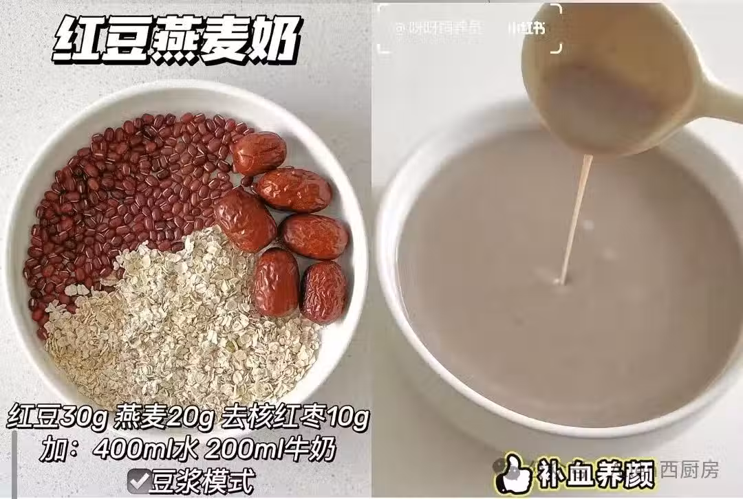 紅豆燕麥奶 - 食材:紅豆30g、燕麥20g、去核紅棗10g - 液體:400ml水、200ml牛奶 - 製作模式:豆漿模式 - 功效:紅豆有補血、利水消腫的作用;燕麥富含膳食纖維,能降低膽固醇、增加飽腹感;紅棗可補氣養血。牛奶補充優質蛋白與鈣。此飲品具有補血養顏的功效,適合氣血不足的人群,有助於改善氣色。