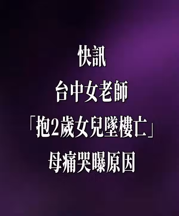 據《ETtoday》報導,台中一棟大樓驚傳,44歲的林女突然帶著2歲的女兒,從12樓一躍而下,傳出巨大聲響,讓周遭的人都嚇傻,趕緊報警處理。