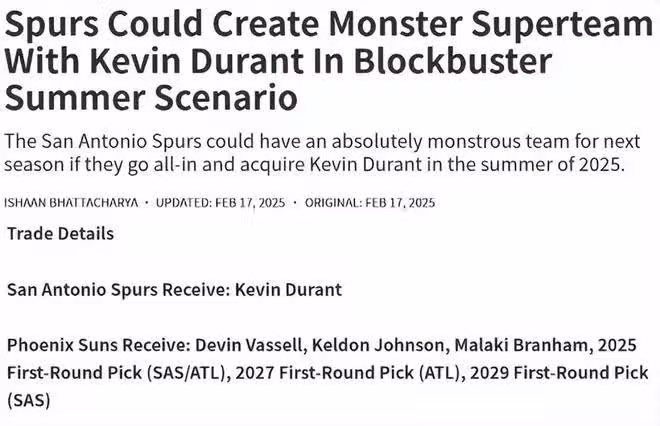 對於巴塔查里亞所提出的交易方案,不得不言,實具相當吸引力。屆時,總經理萊特能夠將德文·瓦塞爾、凱爾登·詹森、馬拉基·布蘭納姆以及三個未來的首輪選秀權送至太陽隊,以單換凱文·杜蘭特。此筆交易於馬刺隊而言,無疑是一場豪賭。然而,鑒於杜蘭特的得分能力與領袖風範,以及他同福克斯、文班亞馬所組成的「三巨頭」的潛在勢能,這般冒險貌似甚為值得一試。