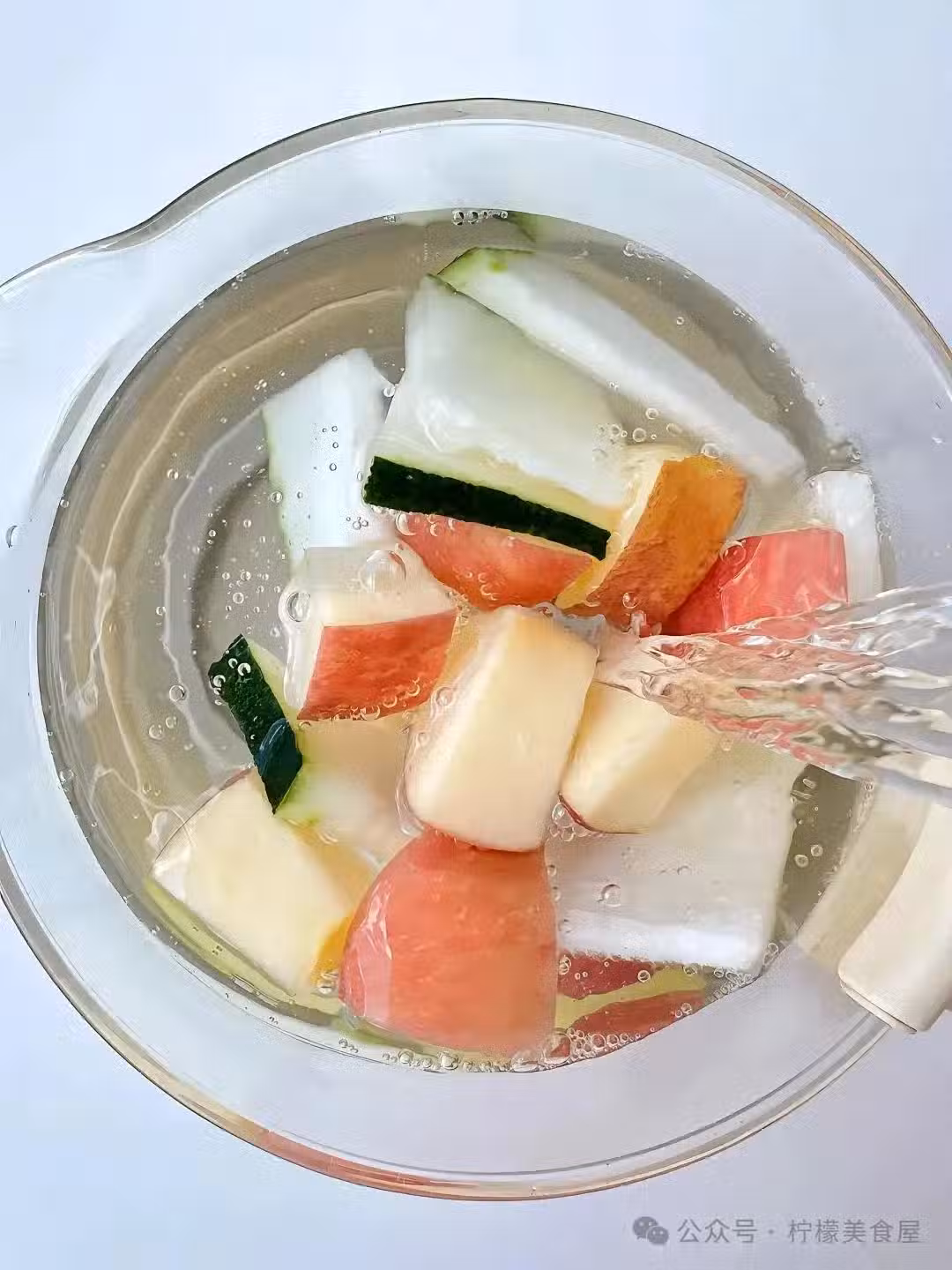 春天天氣悶熱,潮濕,太適合喝蘋果冬瓜生薑水了。 生薑暖胃祛寒、緩解消化不良。冬瓜清熱解毒、利水消腫。煮蘋果水,多加這兩樣食材,具有清內熱、排廢水,消水腫的功效。 容易上火,肚子有贅肉的、濕氣重的寶子,一定要多喝,連喝幾天,脾胃舒服了,身體輕了。 這款蘋果冬瓜生薑水,不單單大人可以喝,小孩也可以喝哦。喜歡甜一點的,也可以加冰糖哦。 食材: 蘋果、生薑、冬瓜 做法: 1、蘋果用鹽搓洗乾淨,去核切塊。生薑去皮洗凈。冬瓜切塊洗凈。 2、所有食材放到鍋里,加適量水,煮20分鐘即可。