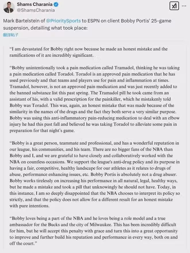 這個解釋有可能是真的,也可能是公關手段。不管是有意還是無意服用,波蒂斯被禁賽已成事實。雄鹿隊總經理喬恩-霍斯特緊急回應:「我們100%支持波蒂斯,他是我們團隊的重要組成部分。但我們尊重和接受NBA的處罰決定。」