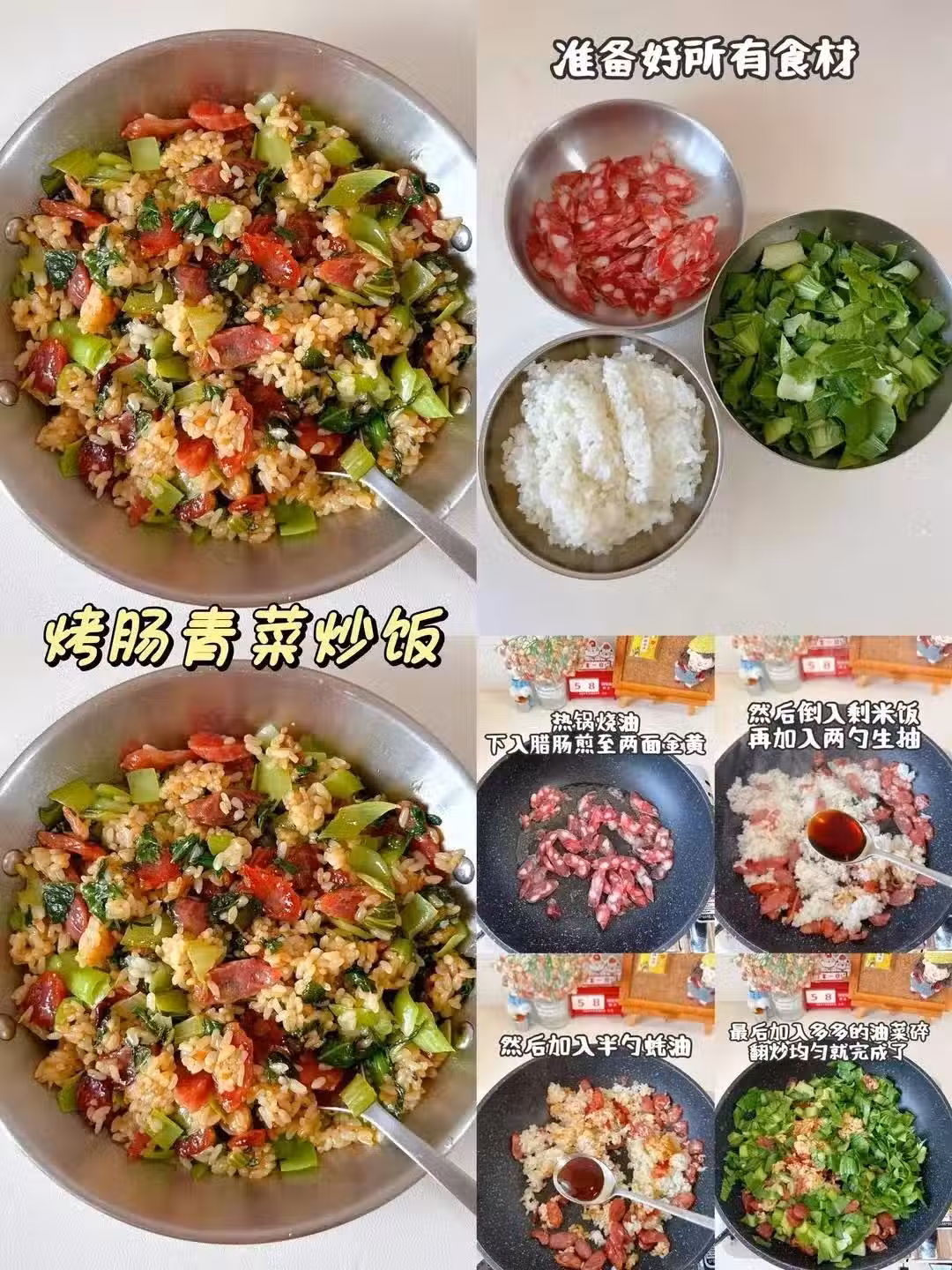 路邊攤靈魂附體!便利店烤腸切片煎出脆皮,小青菜猛火快炒斷生,米飯倒進去和烤腸油充分混合。吃完一抹嘴:「老闆,再加根腸!」