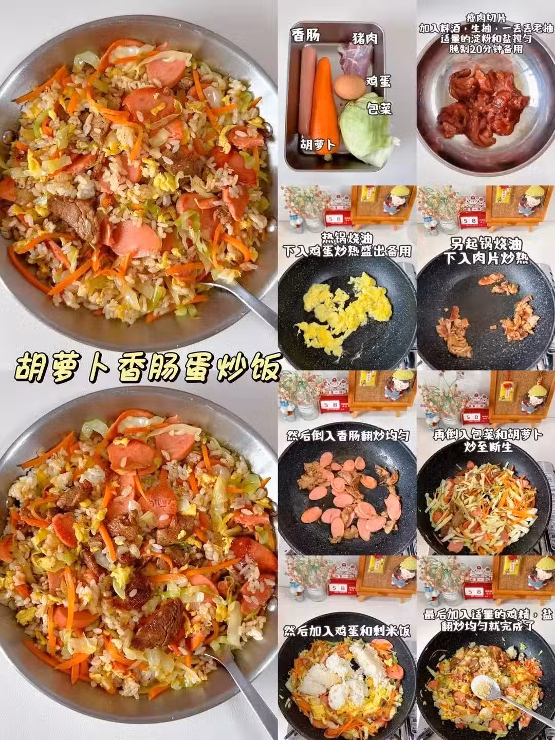 小學門口盒飯攤經典復刻!胡蘿蔔刨絲炒軟,午餐腸切丁煎香,雞蛋液直接淋飯上炒到粒粒分明。吃一口秒回校門口,就是少了塑料勺和五毛錢辣條。