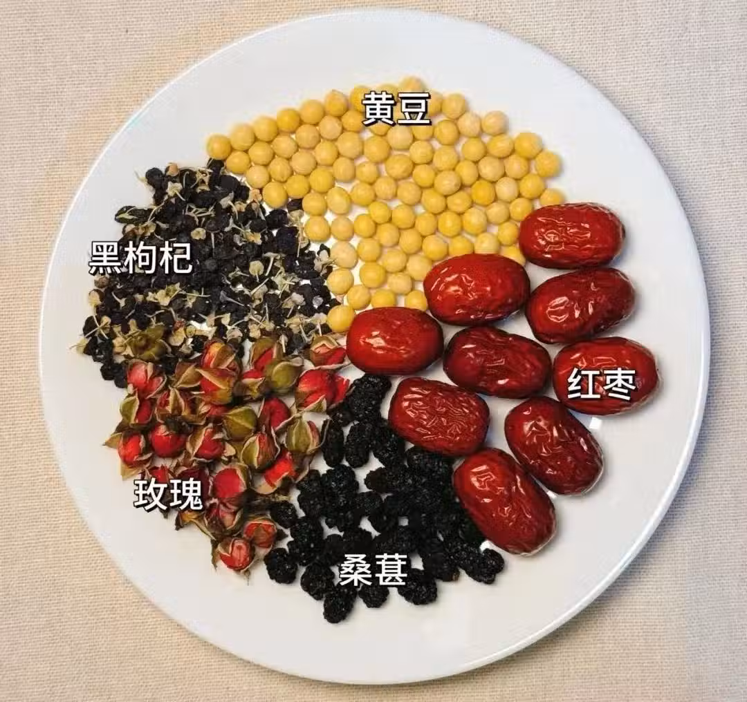 食材:黑枸杞 8g | 桑葚 10g | 紅棗 3顆 | 玫瑰花 3朵 | 黃豆 35g