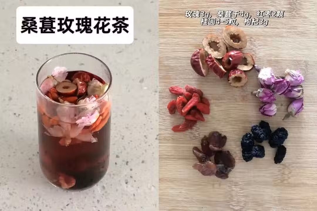 食材:桑葚、金邊玫瑰、桂圓、紅棗、紅枸杞 做法:先用80溫水沖泡玫瑰桂圓紅棗枸杞,等待冷卻10分鐘後再加入桑葚,一天可以反覆續杯~