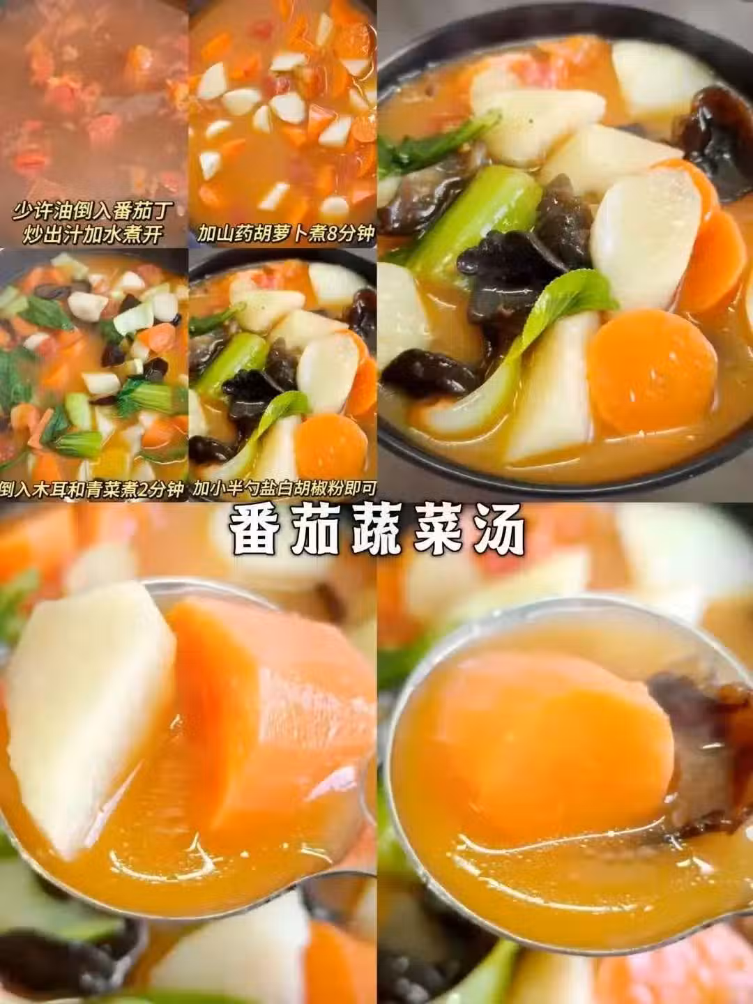 加入山藥和胡蘿蔔煮個8分鐘,快煮好時放木耳和青菜煮2分鐘。