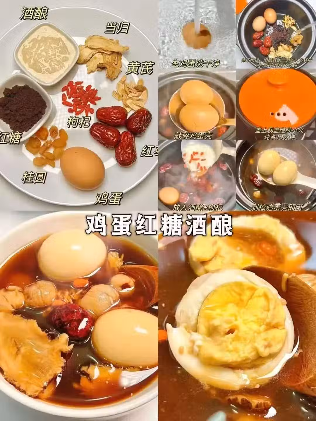 先把雞蛋洗乾淨,和當歸、黃芪、桂圓、紅糖放入砂鍋。