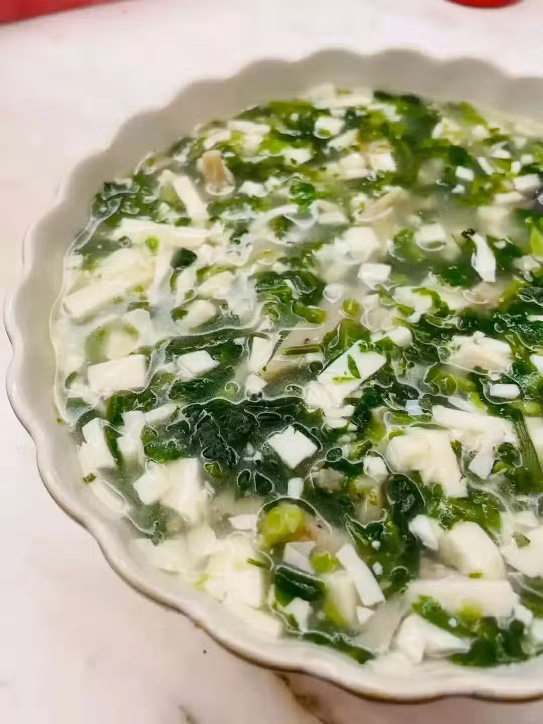 1️⃣ 薺菜焯水擠干切末,嫩豆腐切丁