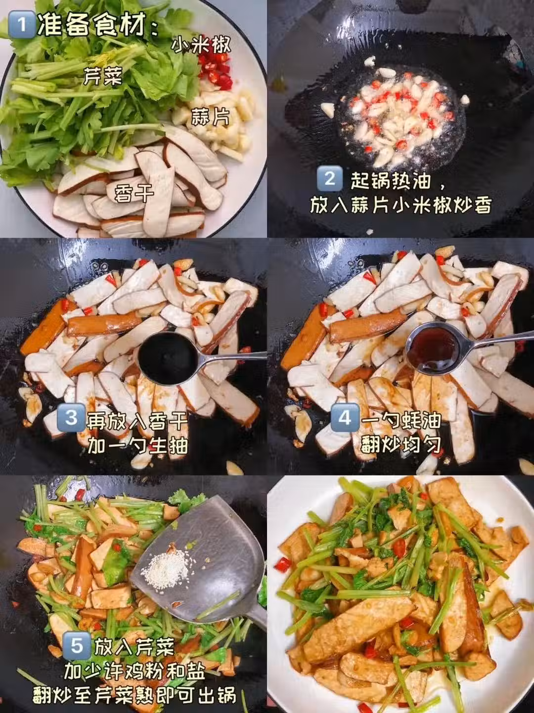 1.芹菜切小段,香乾切片,起鍋熱油,油少一點,放入小米辣蒜片炒香