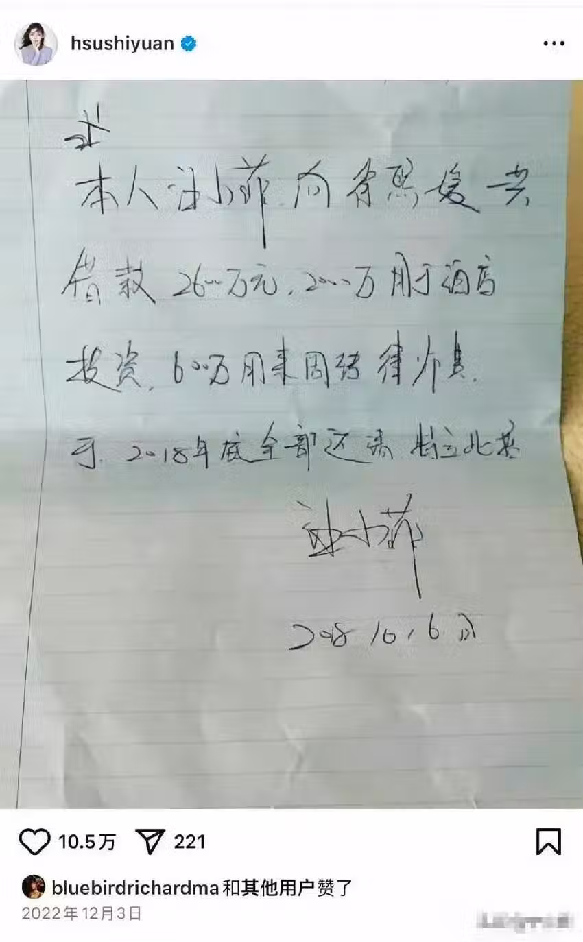 而此次S媽準備向汪小菲討要的2.5億欠款,包含的,就有台北信義豪宅每個月的房貸,離婚書里的精神賠償,撫養費等,還有汪小菲向大S2600萬的借款,當初用來開台北酒店的。
