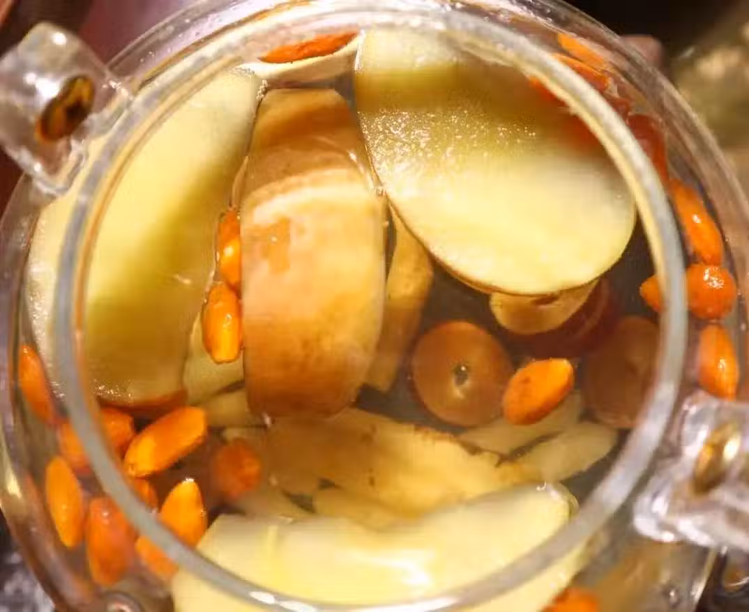 這款蘋果水特別適合脾胃虛弱、消化不良、容易腹瀉的人,山藥、茯苓、芡實都是健脾補腎的好食材,喝起來清甜可口,還能改善濕氣。