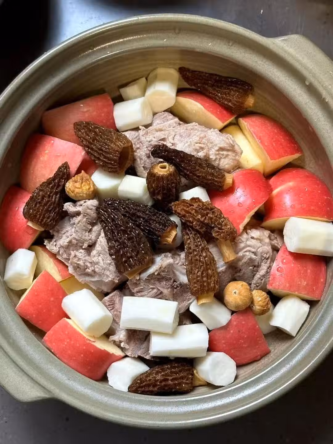 豬骨冷水下鍋焯水,洗凈浮沫;蘋果用鹽清洗表皮,切塊去核;羊肚菌清洗乾淨提前浸泡5分鐘,流動水沖洗內里去沙;所有食材放入鍋中,加水,大火煮沸轉小火1小時,出鍋加鹽調味即可(不放鹽也很好喝,清清甜甜的)